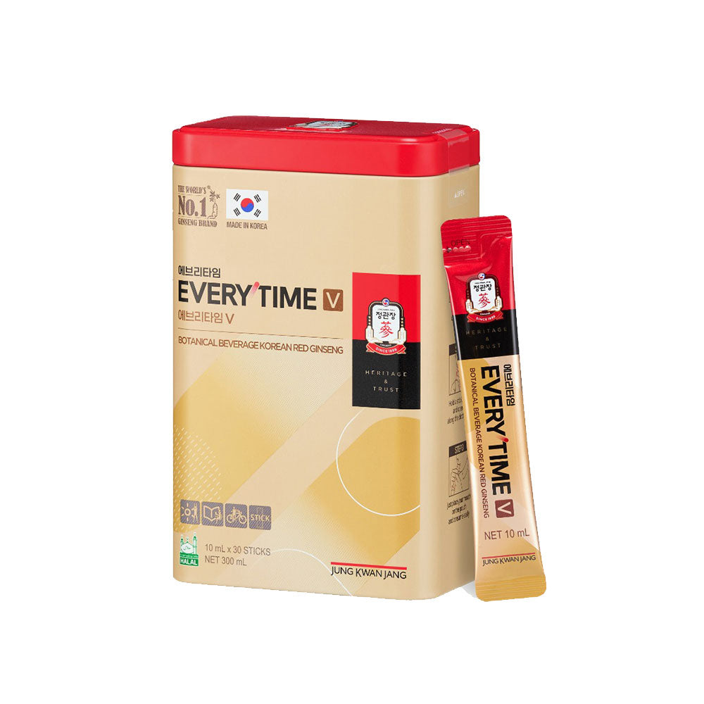 The World's No.1 Ginseng brand with trendy and convenient stick shape. Everytime V contains 990mg of Korean Red Ginseng Extract to improve overall health with 6 key health benefits (boost immunity, overcome fatigue, improve memory, increase antioxidant activity, improve blood circulation and relief menopausal symptoms). This red ginseng product designed in a stick pouch-type is easy to carry and can be taken anytime and anywhere. Certified by KMF Halal, GMO Free, Vegan friendly, Caffeine free, No preservatives.