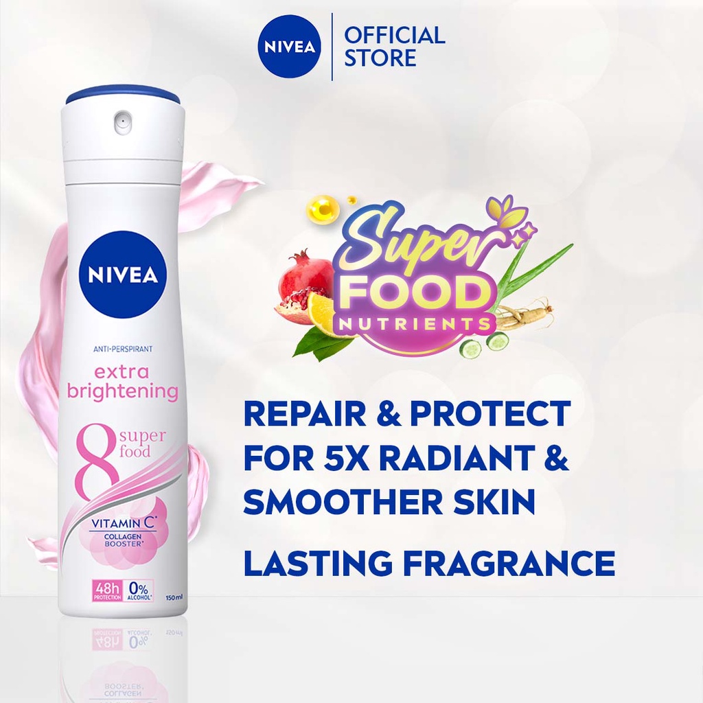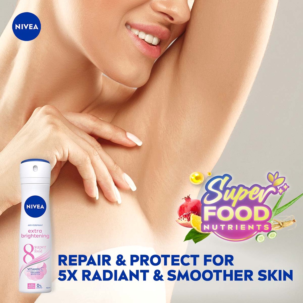 NIVEA DEODORANT EXTRA WHITENING enriched with 10 skin nutrients to nourish, repair and whiten underarm skin. The optimal combination of reliability, beauty, and care. With Skin Nutrients & Vitamins to tightens pores and smoothns skin. Effective 48 hours anti-perspirant protection and gentle care.