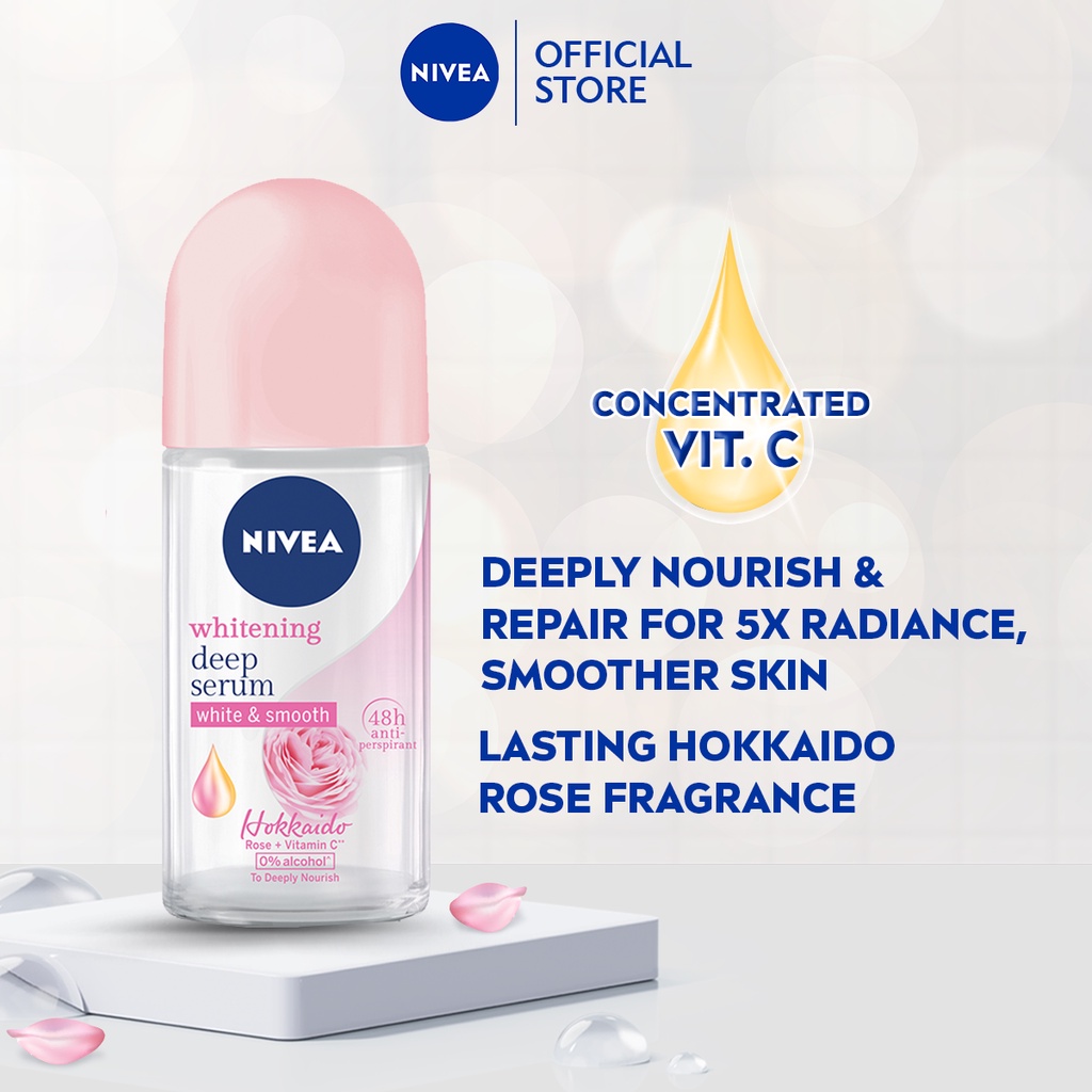 NIVEA Whitening Deep Serum White & Smooth Hokkaido Rose Deodorant with serum formula contains concentrated Vitamin C and precious Hokkaido rose essence gives you the deep nourishment to repair for visibly fairer and smoother underarm skin. Complemented with a lasting burst of luxurious Hokkaido rose fragrance, you will feel amazingly confident and beautiful all day long.