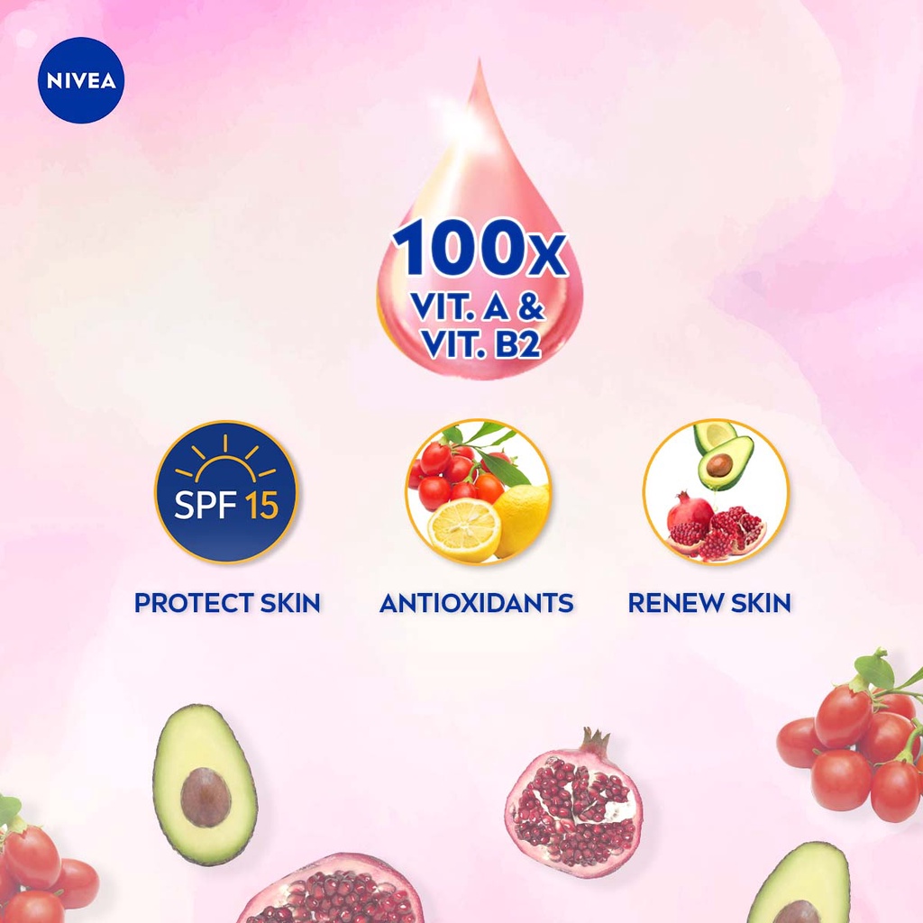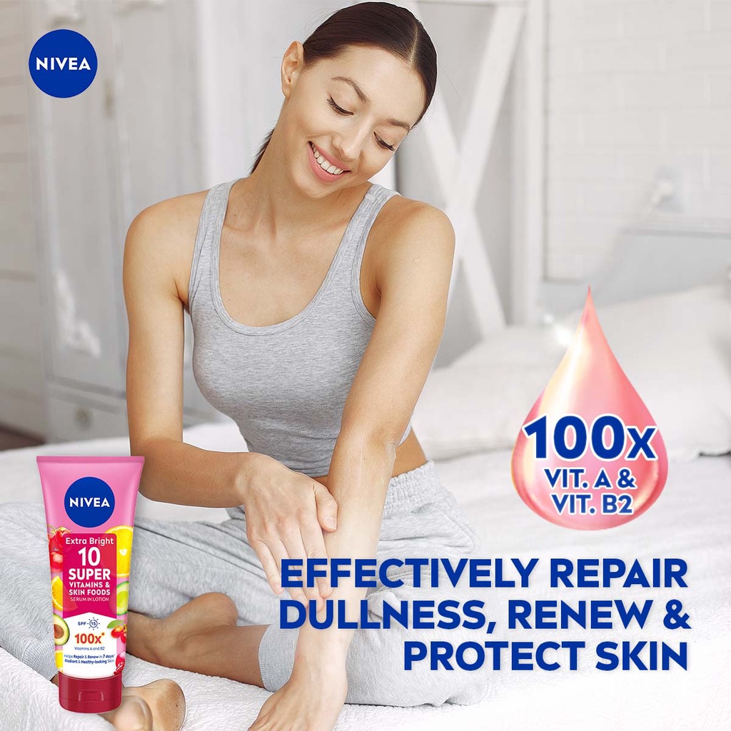 NIVEA Extra Bright 10 Super Vitamins & Skin Foods Serum in Lotion contains 100x Vitamin A to repair skin & Antioxidants to renew skin for radiant, healthy youthful skin in 7 days