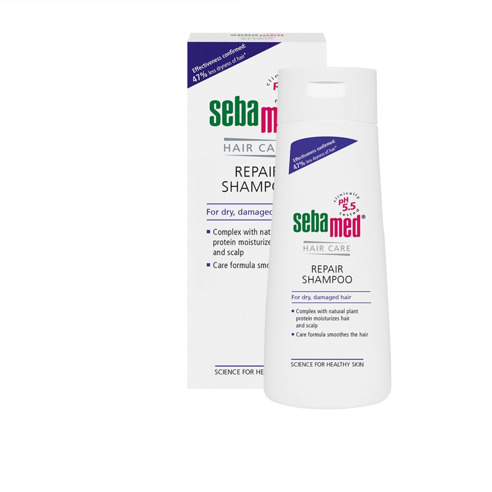 100% Soap and Alkali free with pH value of 5.5 - the same pH of healthy skin. sebamed Repair Shampoo with natural plant protein helps stabilise the hydro-balance of hair and scalp. Care formula helps smooth the hair.